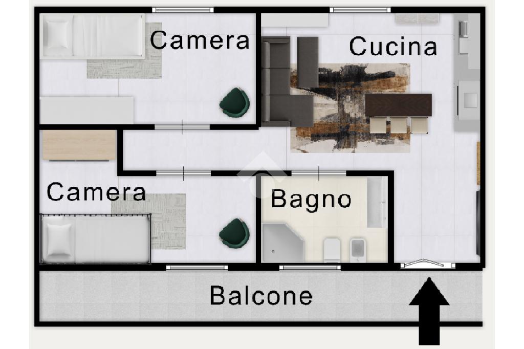 Gli spazi consentono di realizzare la zona giorno con cucina a vista, due camere da letto e il bagno.