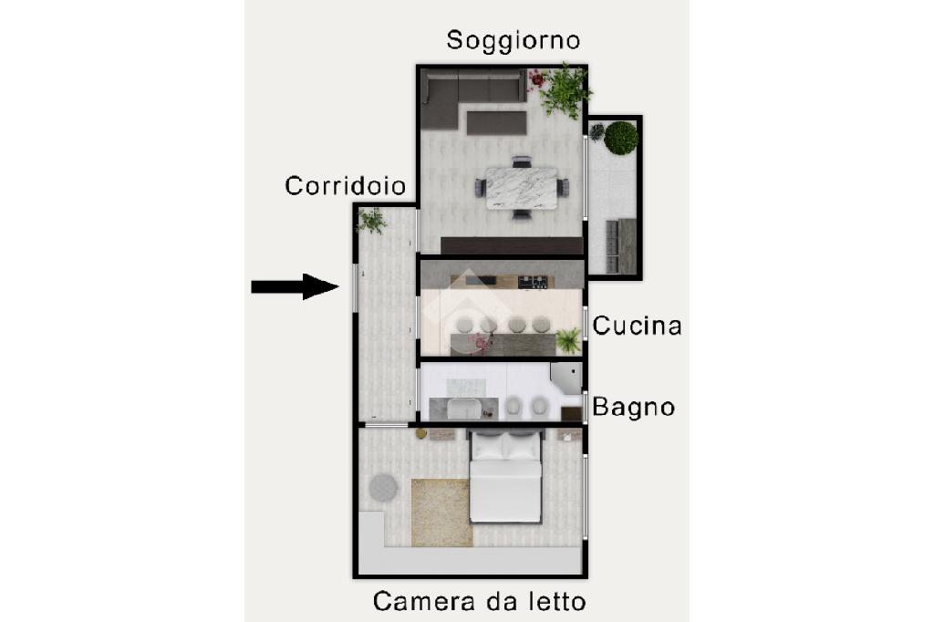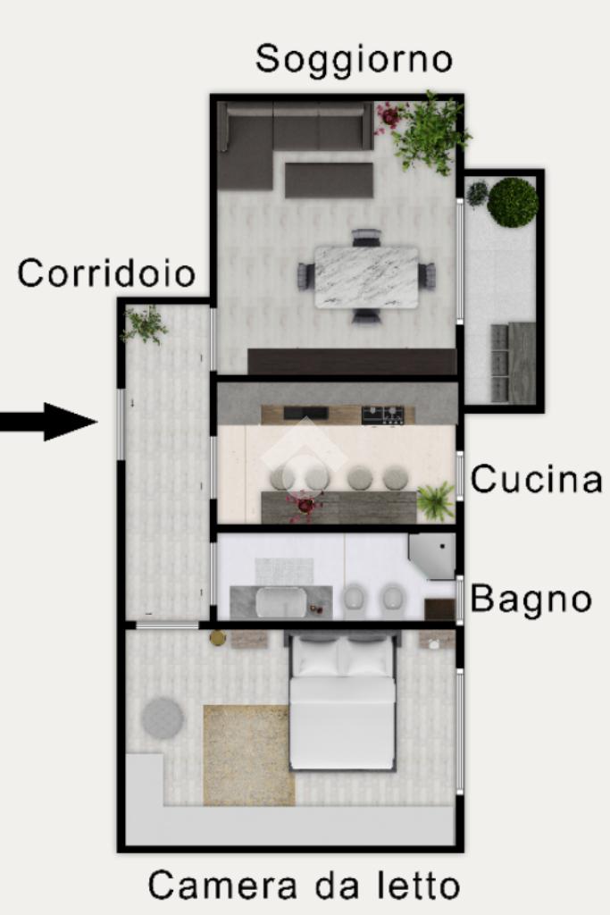 La zona giorno è composta da un soggiorno luminoso e da una comoda cucina abitabile, ideale per chi desidera un ambiente separato e vivibile. La zona notte ospita una spaziosa camera matrimoniale e un bagno finestrato. Completa la soluzione un balcone con affaccio riservato e una cantina al piano interrato.