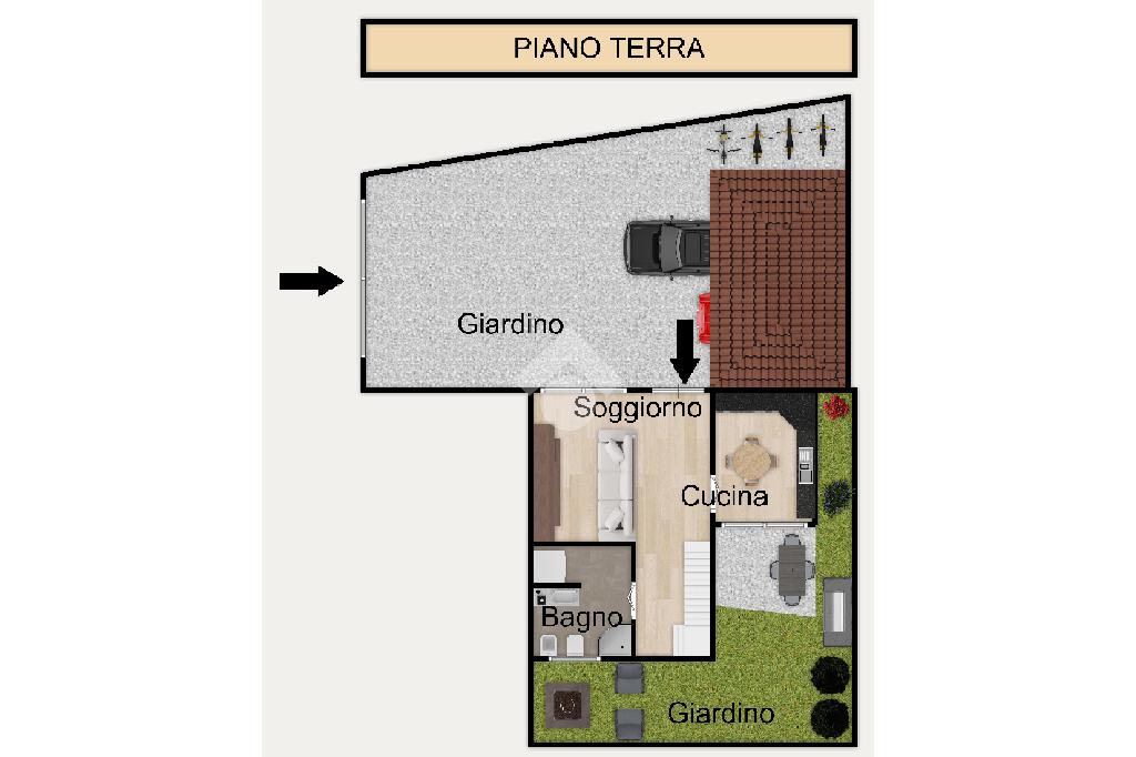 L’ingresso sfocia nella zona giorno di generose dimensioni, completa di camino e prosegue con la cucina abitabile dotata di sfogo esterno sul portico, ideale per condividere piacevoli pranzi e cene all’aria aperta. Completa il piano terra il bagno di servizio finestrato con doccia con annessa la lavanderia.