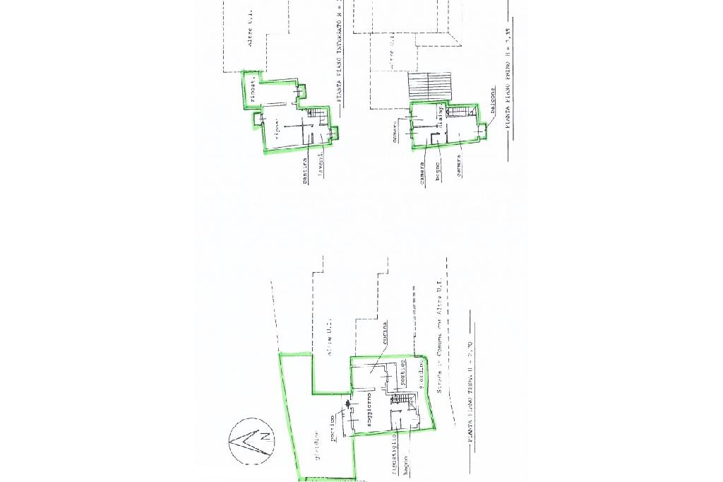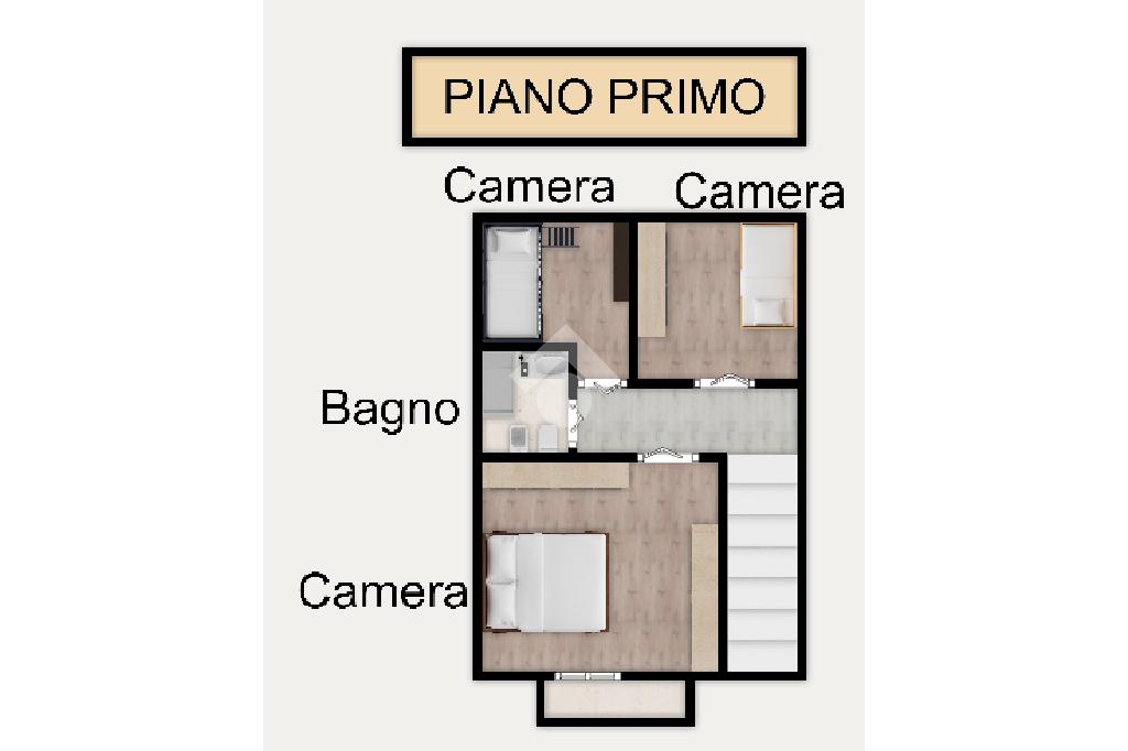 Attraverso la scala interna si raggiunge il piano primo completo di camera da letto matrimoniale con sfogo esterno su balcone, altre due camere da letto e bagno finestrato con vasca.